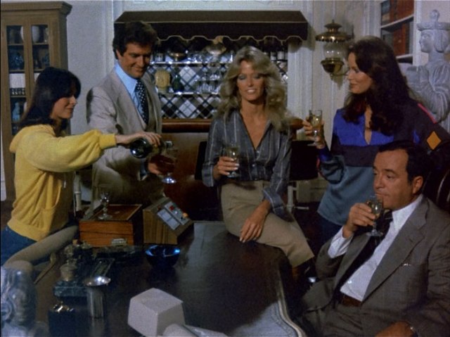 Sabrina teaches Bosley to chant.The look of impish glee on Sabrina’s face is priceless.Jill dishes with Sally.Kelly plays it cool.Who doesn’t love a man in uniform?This reminds me of Jill faking stomach cramps in “Angels in Chains”.Hey, Billings, three’s a crowd.This would make a cool album cover.Jumpin’ Jack Flash…it’s a gas, gas, gas!You’re love is like bad medicine.Can Sabrina be my therapist?“Charlie Townsend is a no-good, sadistic, totally insensitive male chauvinist pig.” That’ll do, pig. That’ll do.Let’s toast to Sabrina’s fab outfit.“I got a two-week pass, and me and you will never have to leave the house.”